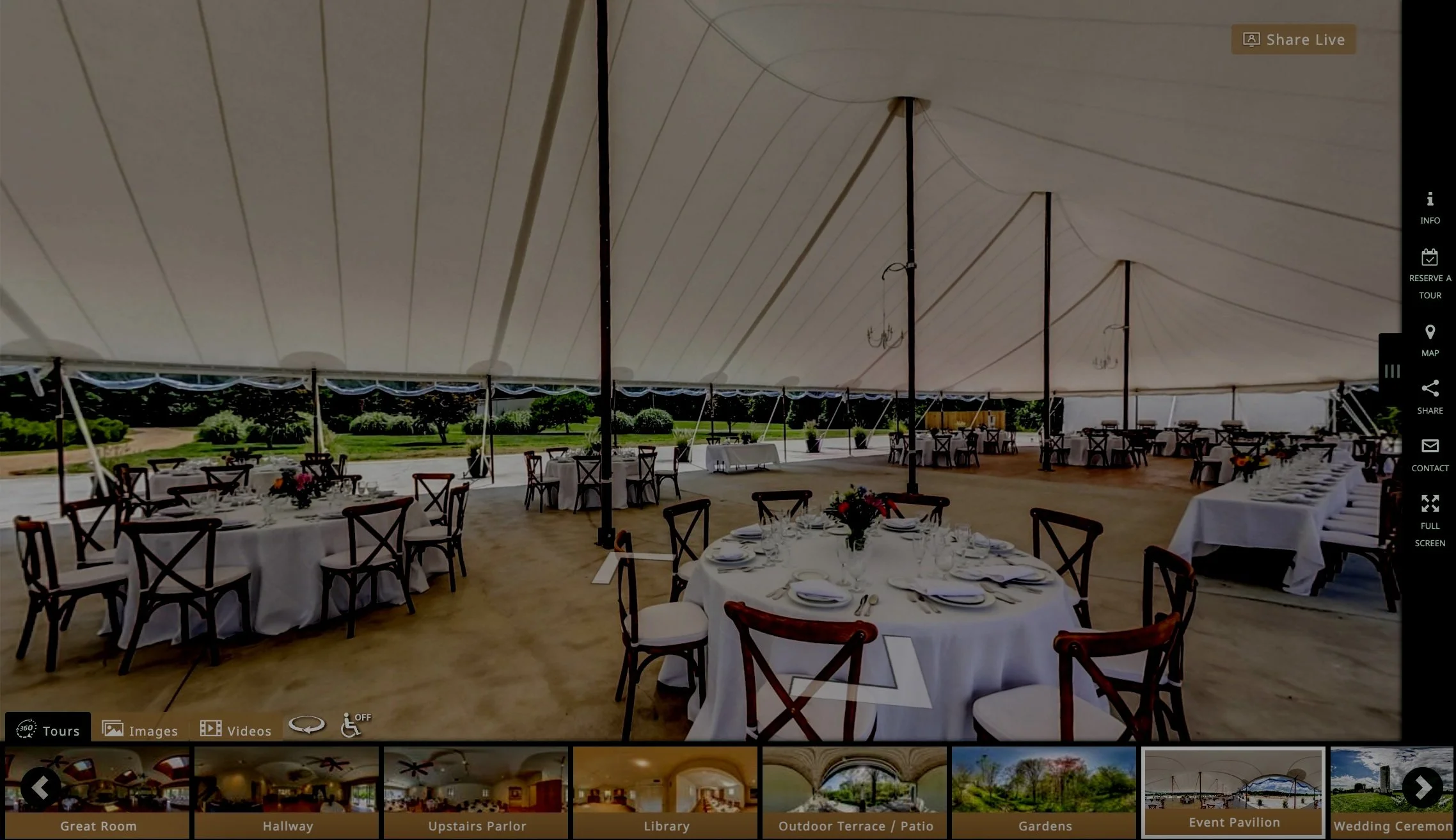 Our largest space is situated just steps from the pergola, which is used for many of our outdoor wedding ceremonies. It is a permanent sailcloth tent with permanent flooring, lighting, and beautiful views. There is a restroom facility on site.